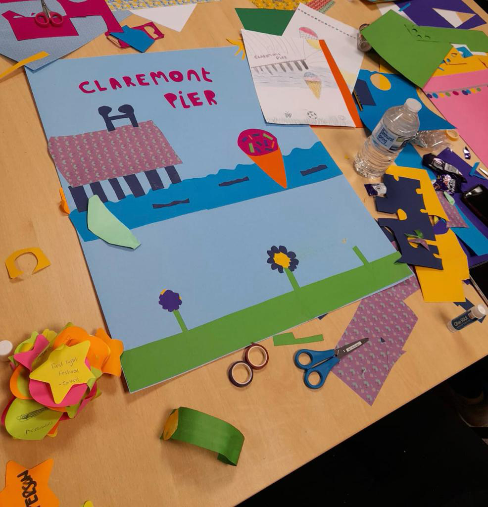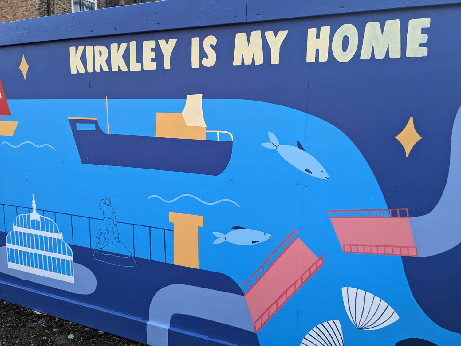 At 5 workshops in schools and community spaces, Catalina gathered ideas, stories, memories and drawings to explore the brief. People shared memories of experiences of events in the town, images of buildings, and stories about days out, but overwhelmingly, the response was that ‘Kirkley is My Home’, the title of the mural.