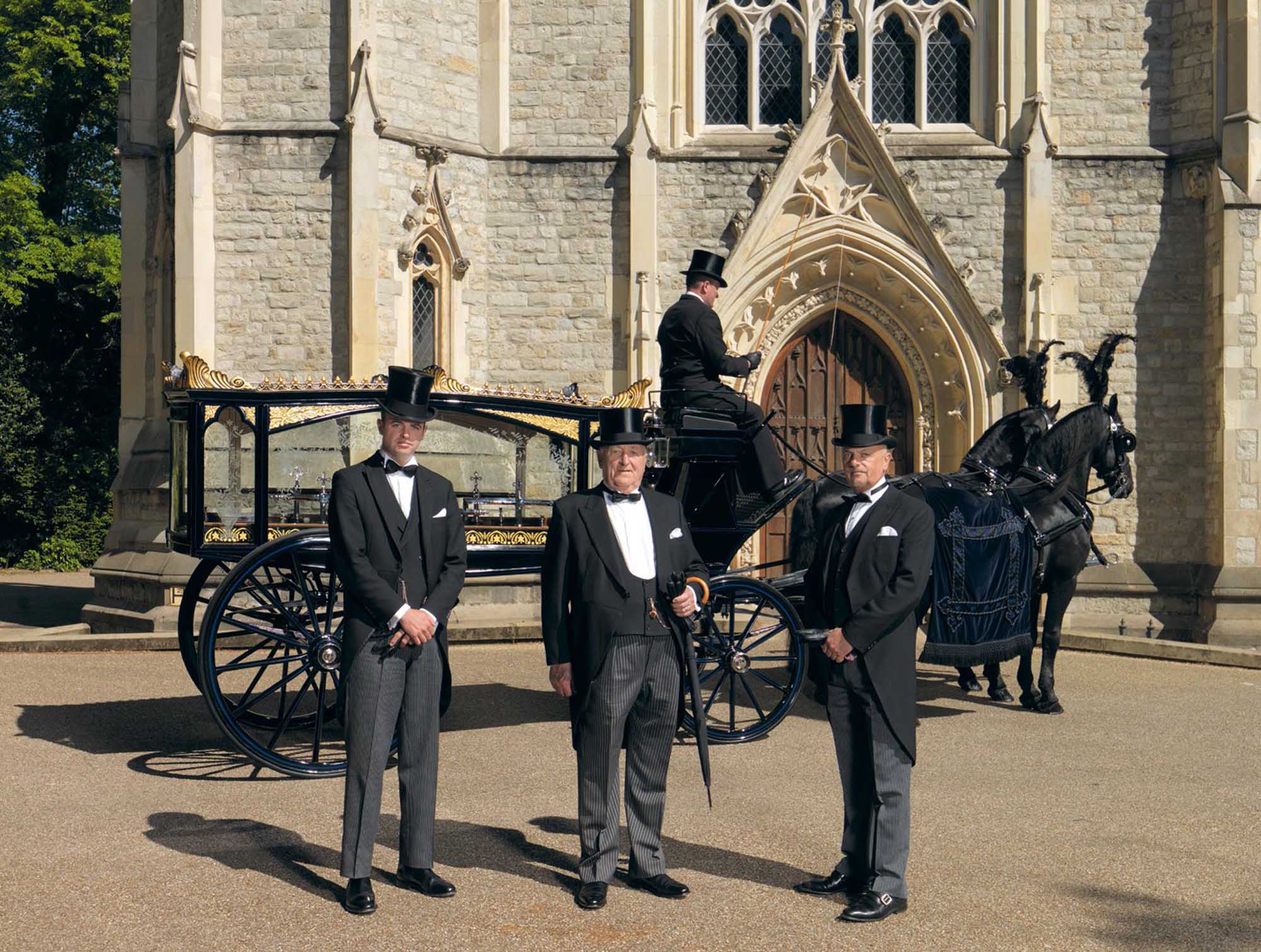 - John, Stan and Jack Harris, of T Cribb & Sons, photographed outside City of London, Cemetery Church, Newham. T Cribb & Sons is a fifth generation family-run funeral directors established in 1881.