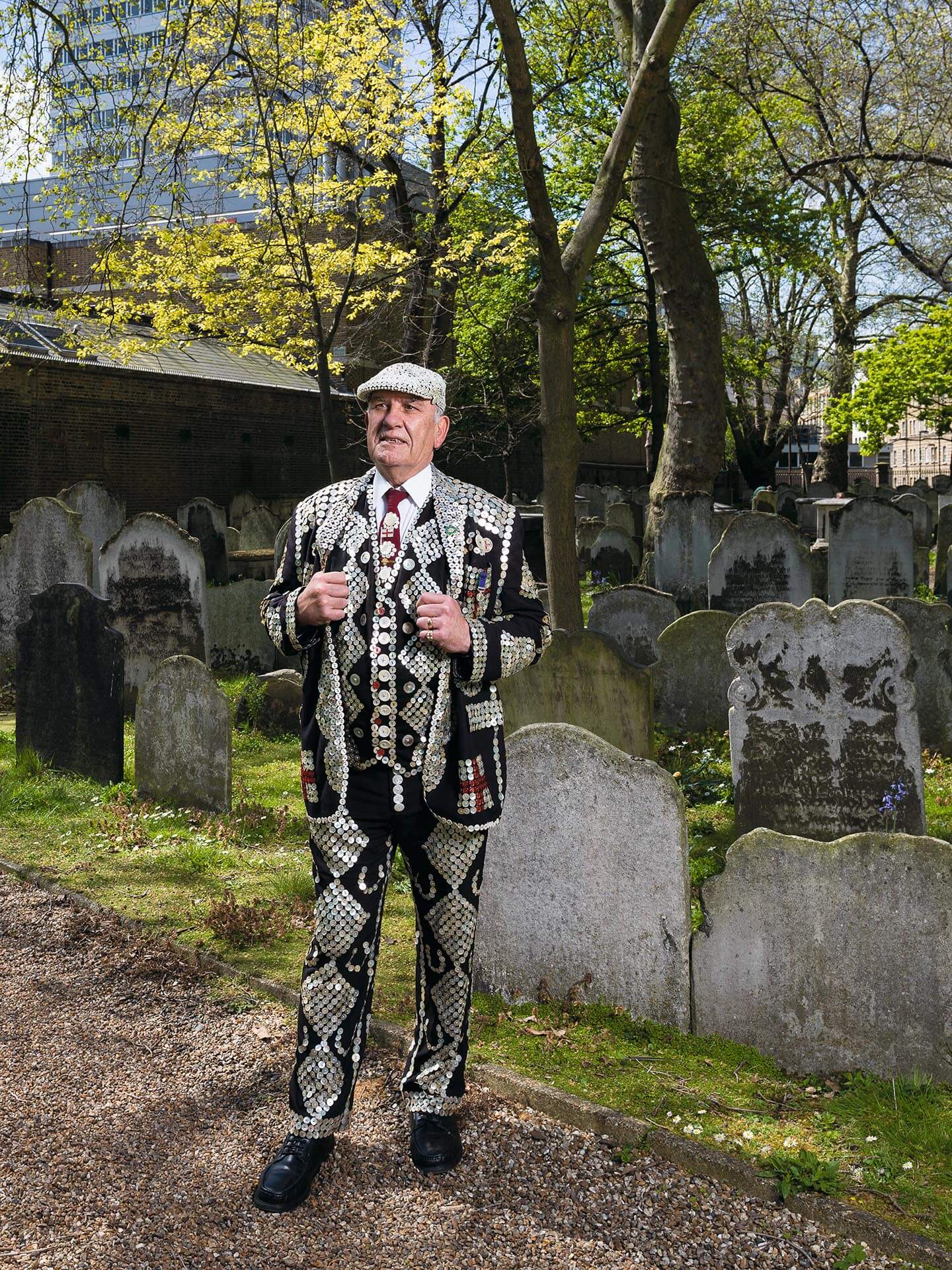 - John Walters, Pearly King of Finsbury, photographed at Bunhill Fields, City Road. The London Pearly Kings & Queens Society began in 1875. Each London borough has a king and queen who continue the tradition of raising money for charities. John played in Bunhill Fields as a child. A proud East Londoner, it reminds him of happy days.