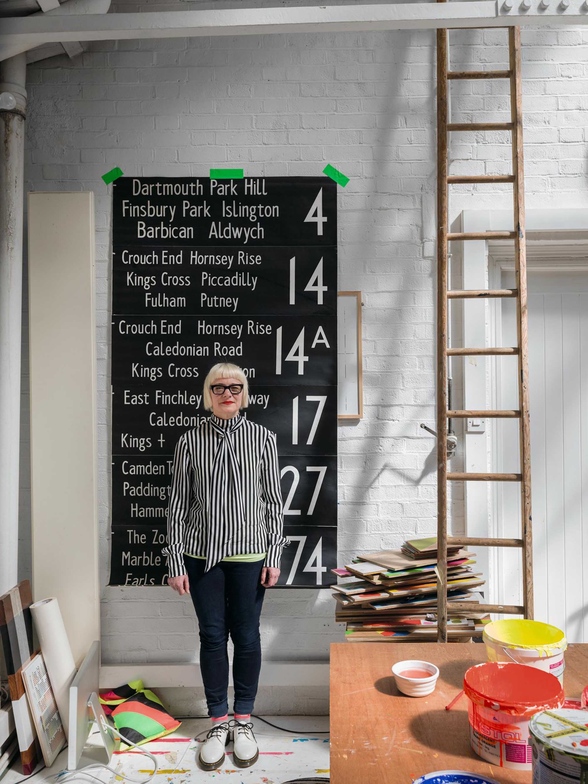 - Morag Myerscough, Artist and Designer, photographed at her studio in Hoxton. Morag makes engaging and colourful public installations for communities to enjoy. Her bright and bold designs can be spotted across London, including in the Design Museum at High Street Kensington.