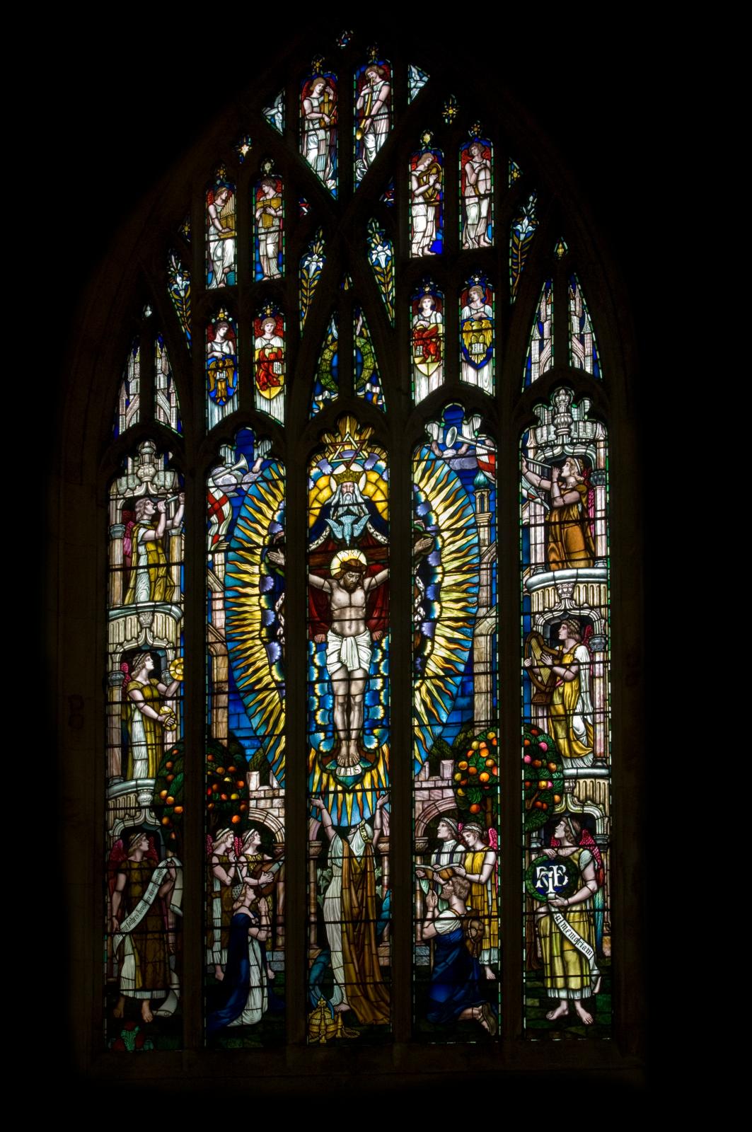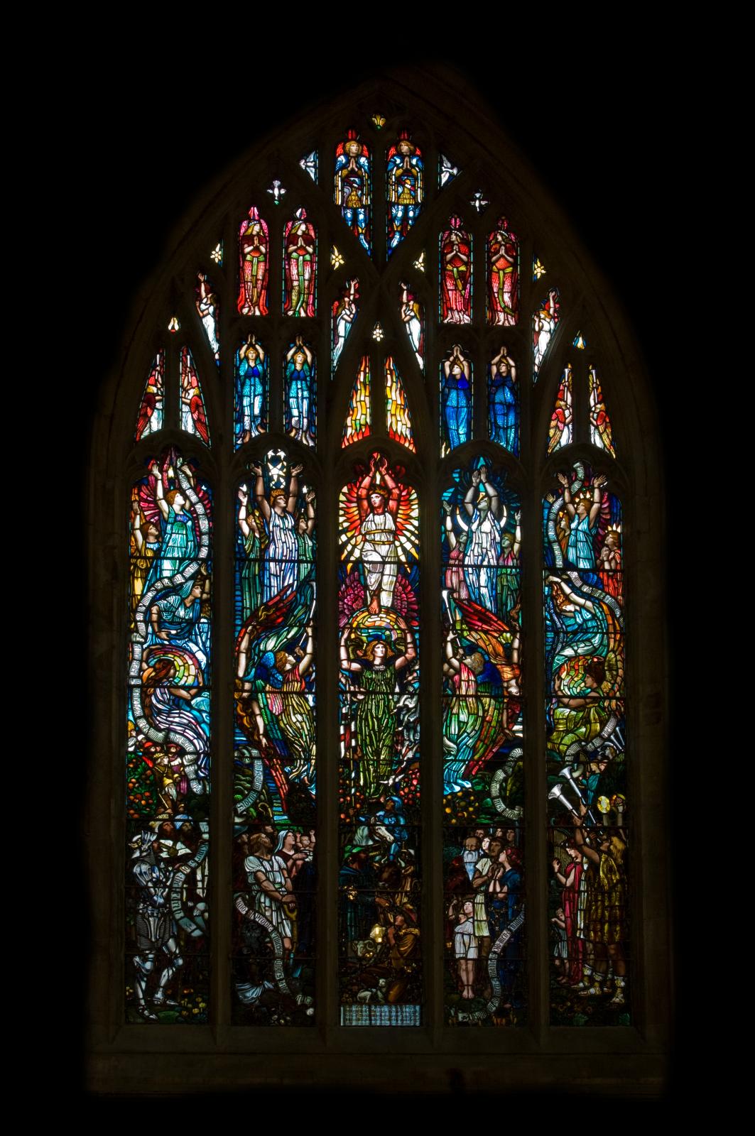 The stained glass includes two fine windows by late-Victorian designer Walter Crane.