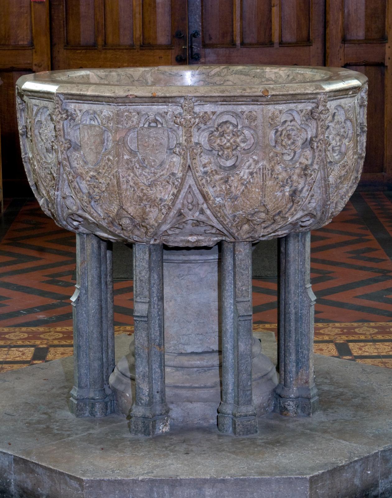 Inside, the slender masonry structure and large windows give an impression of space and light. Fittings include an elaborate marble font of about 1380, late medieval bench ends and a stone pulpit with curving staircase from the 1840s restoration.