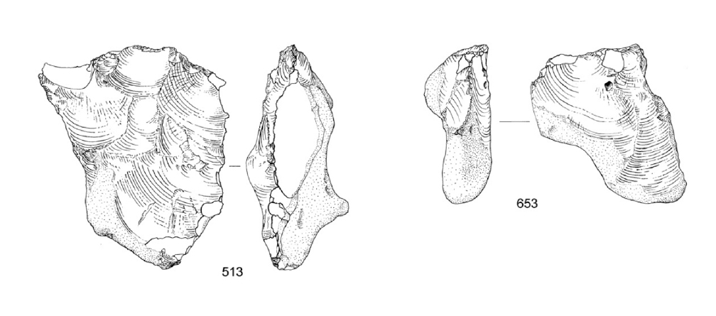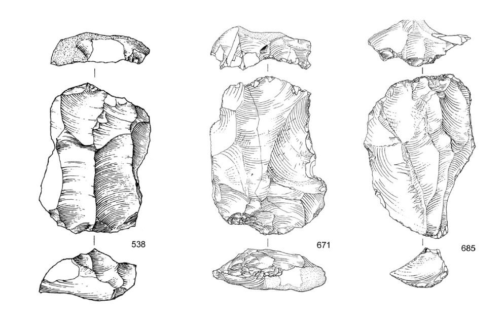 Handaxes numbered 54, with nine from the quarry; most were of pointed type and in a rolled condition. The artefact distribution, which also includes those from the ‘reject heap’ (see above) shows that 87% come from the footprint of the Belbin Formation. They included three ‘proto-Levallois’ flake cores (Figure 4), characteristic of the Lower–Middle Palaeolithic transition period.