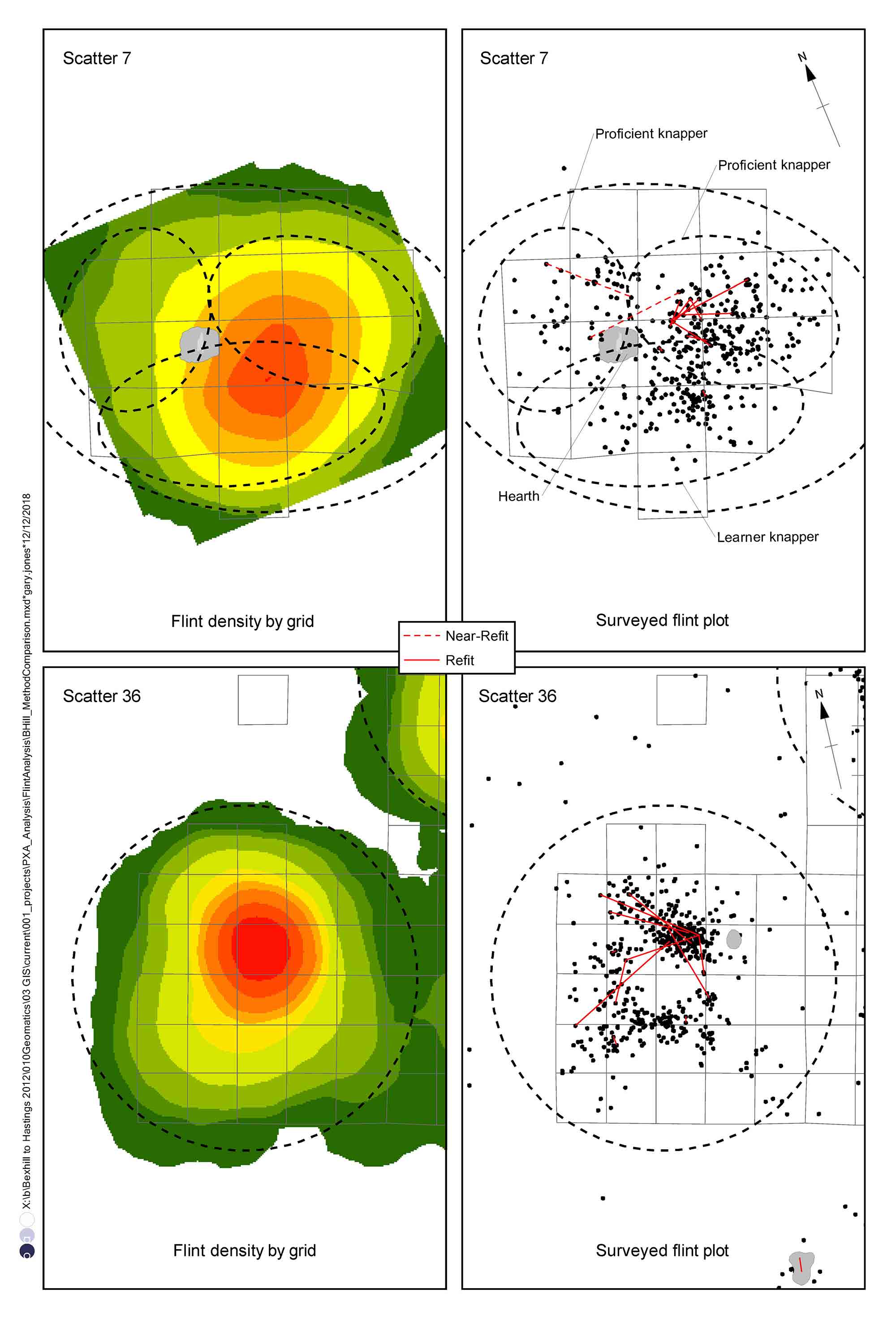 One example of this was at scatter 7 where it appears as if two knappers of varying skill attempted the same tasks while a very experienced knapper sat across a hearth from them and corrected any complex errors (Fig 7.3). Such a teaching scenario would have been impossible to infer through whole-earth sampling. Other more prosaic examples include identifying ‘butterfly’ gaps in the scatters where an individual had sat (Fig 7.4).