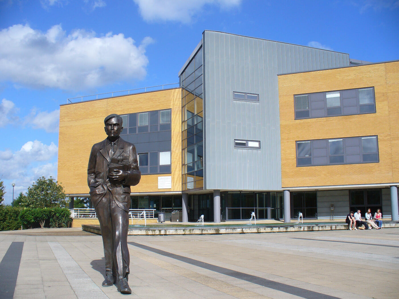 Turing led the deciphering of the German Enigma machine during World War Two at Bletchley Park, where he is commemorated with a statue by Stephen Kettle. There is also a statue of Turing at the University of Surrey, and a Turing Mosaic in Milton Keynes.