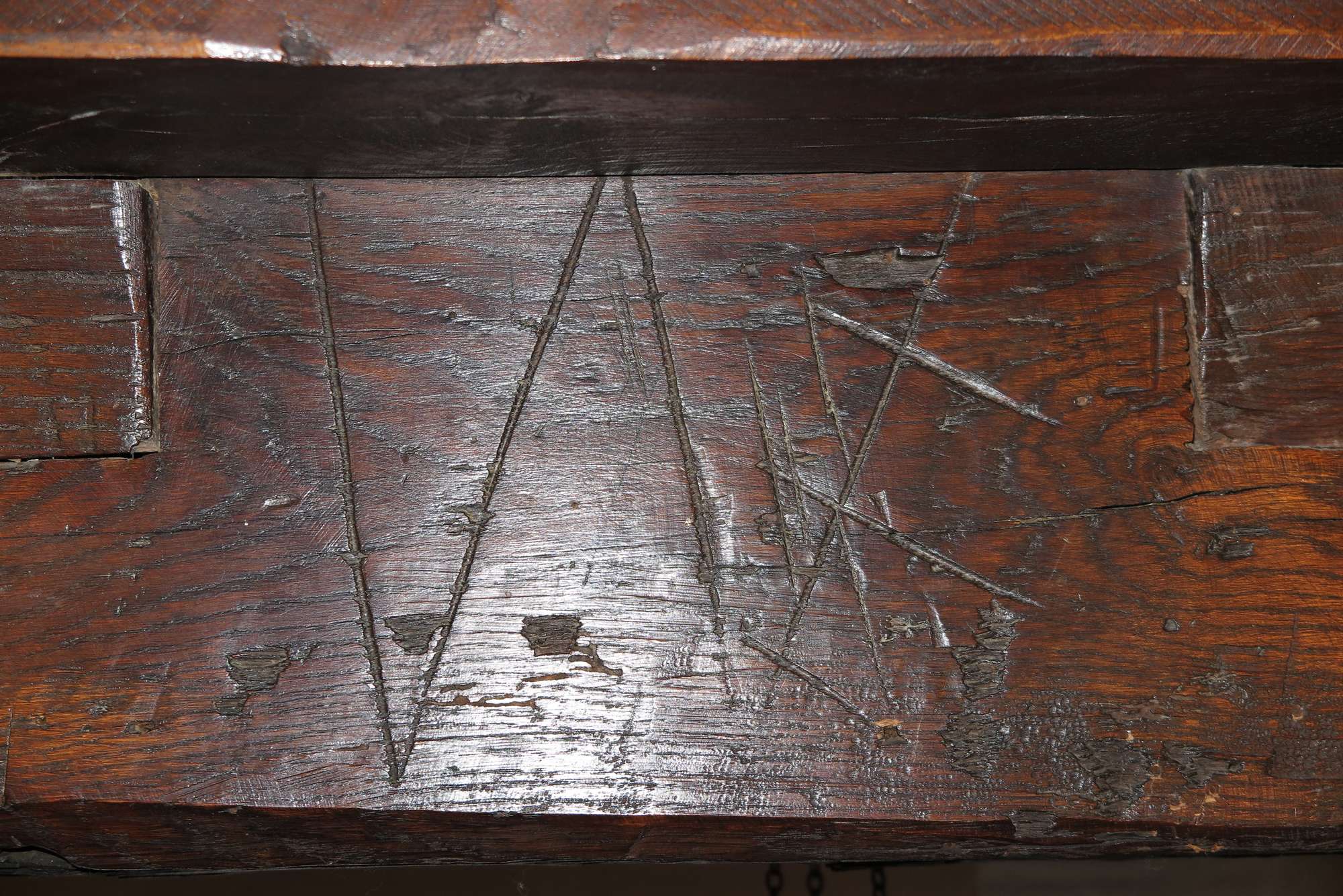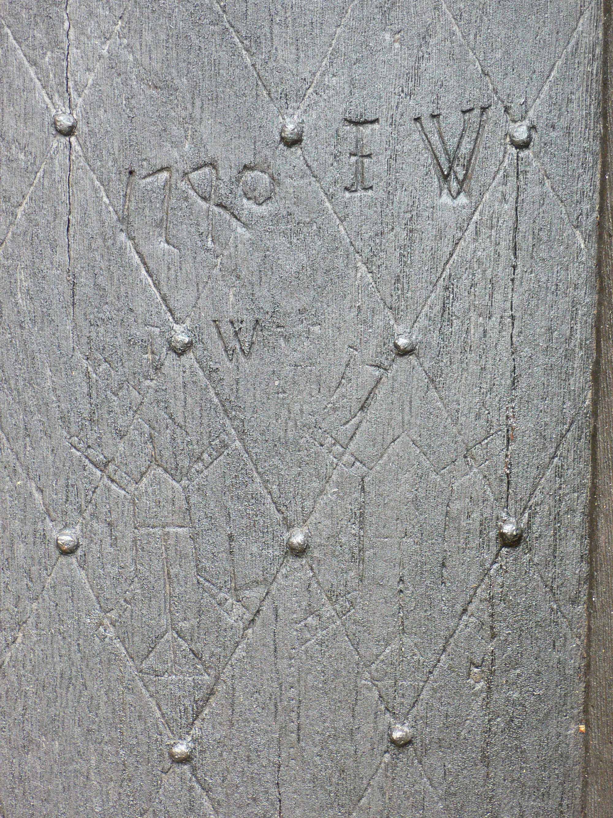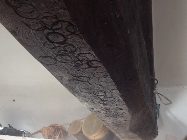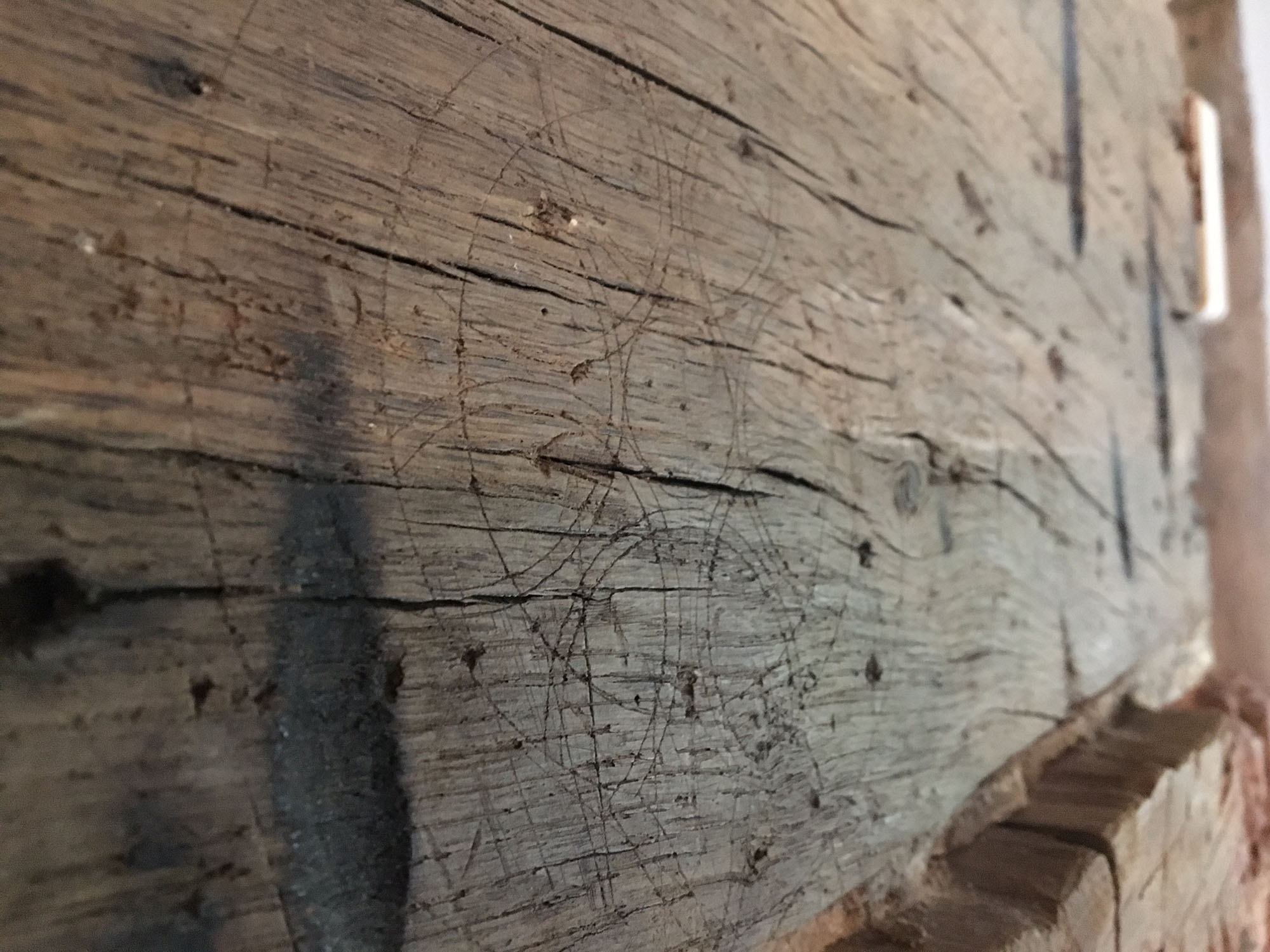 The timber examples are particularly interesting in that they offer the best potential for dating. One beautiful example on a ceiling beam was clearly scribed onto the timber whilst it was still green, or fresh. As the timber aged it dried out and developed cracks which slightly distorted the design. This suggests the mark was made when the timber was new, perhaps during the construction of the building.