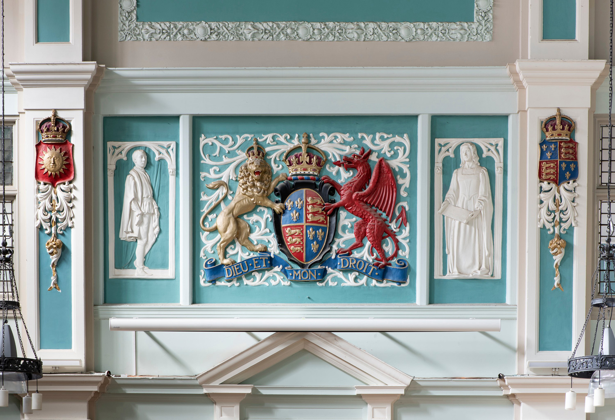 The hall is home to ornate plasterwork, including the coat of arms of King Edward VI, bands of flowers and foliage, and shields with lions. The hanging light fittings also feature metal foliage and fleur-de-lys emblems. King Edward VI's monogram features on the wrought iron entrance gates.