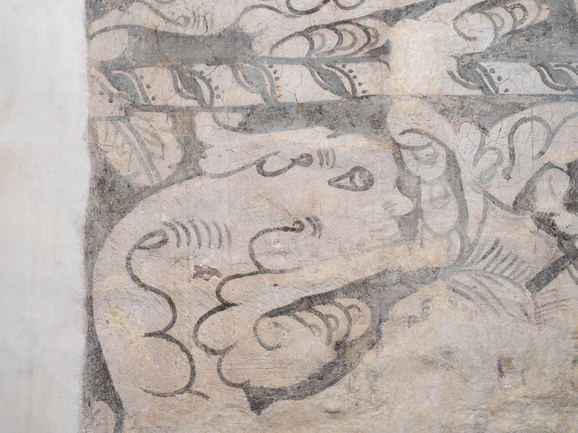 A small fragment of wall painting – similar to that seen at nearby Dacre Hall – has been visible in the house since before we acquired the property over 20 years ago. However, recent work to the primary upstairs bedroom revealed much more of the composition. Removing old failing plaster to find these remarkable motifs and faces looking back at us is a moment we will never forget.