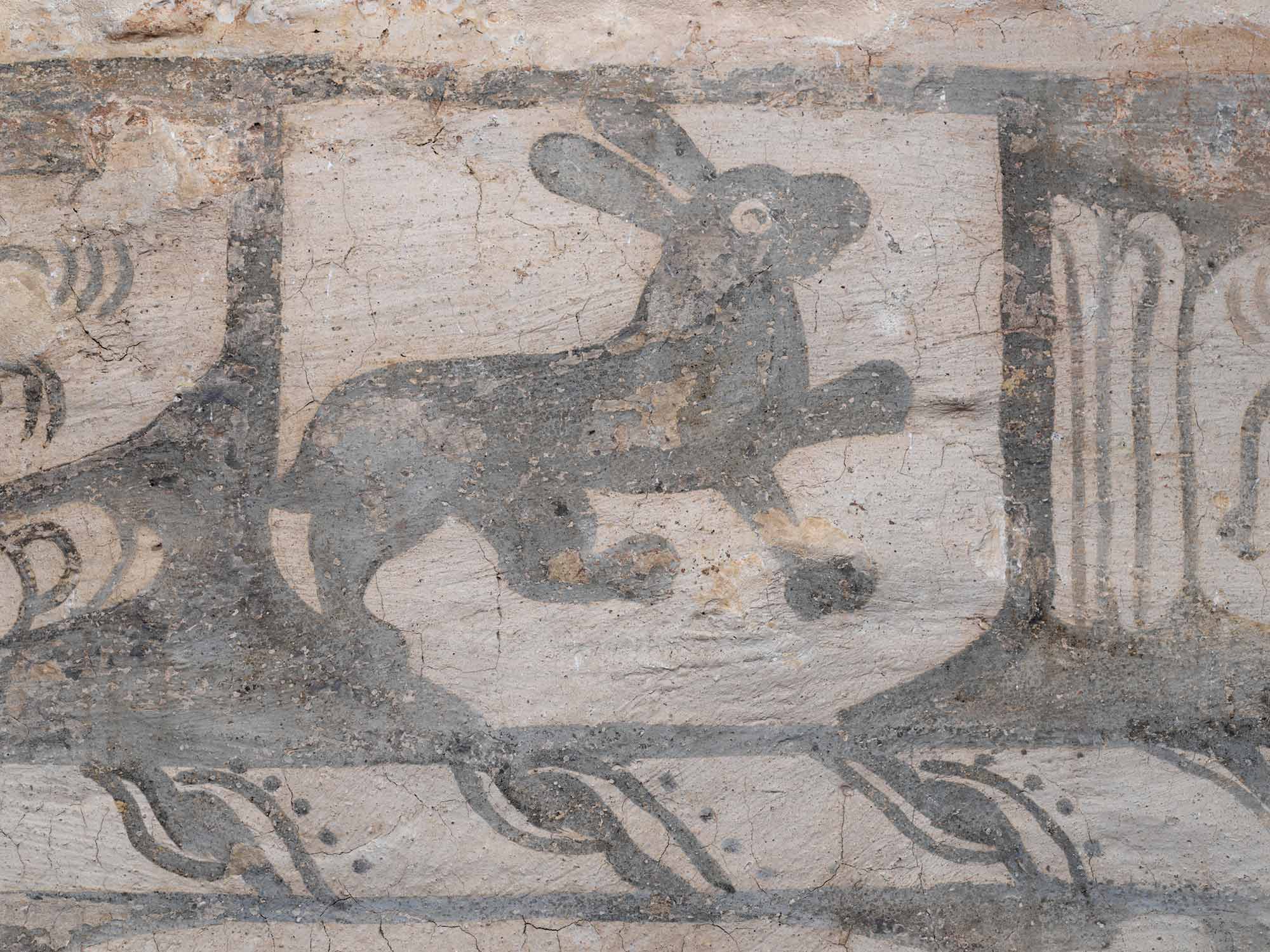 The Grotesque style paintings feature fantastical beasts and foliage arranged in decorative panels. Found on some of the lodge’s internal walls, evidence suggests the artwork originally covered a larger area within the rooms.