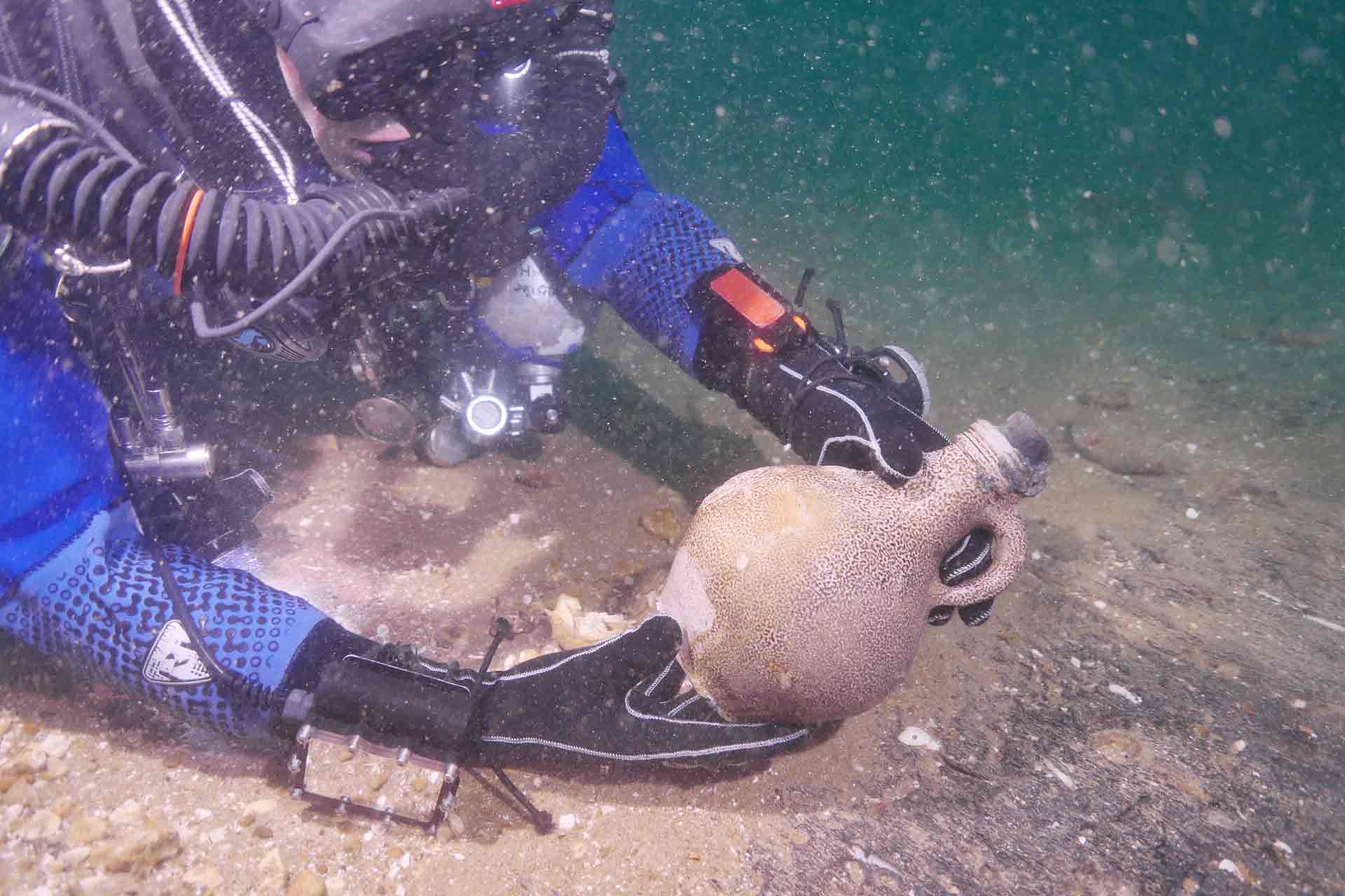 In 2021, damage to the site was documented by NAS divers, which led to a joint decision by the RCE and Historic England to support further investigation of the wreck. The three organisations are involved in a project to forensically mark the objects on the seabed. This is a new form of technology that makes objects traceable: a large step forward in the protection of vulnerable underwater archaeological sites.