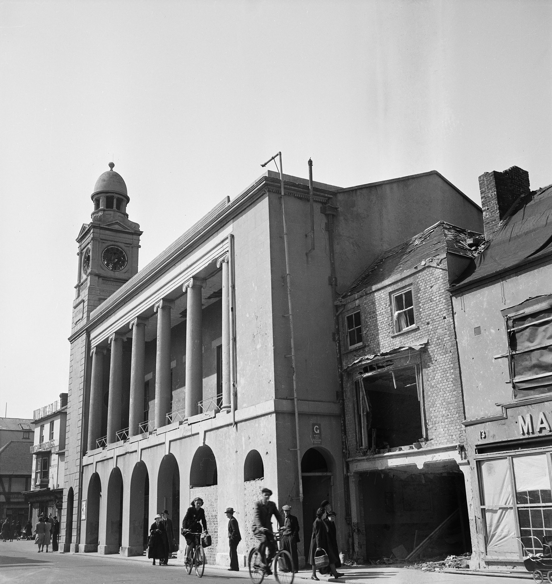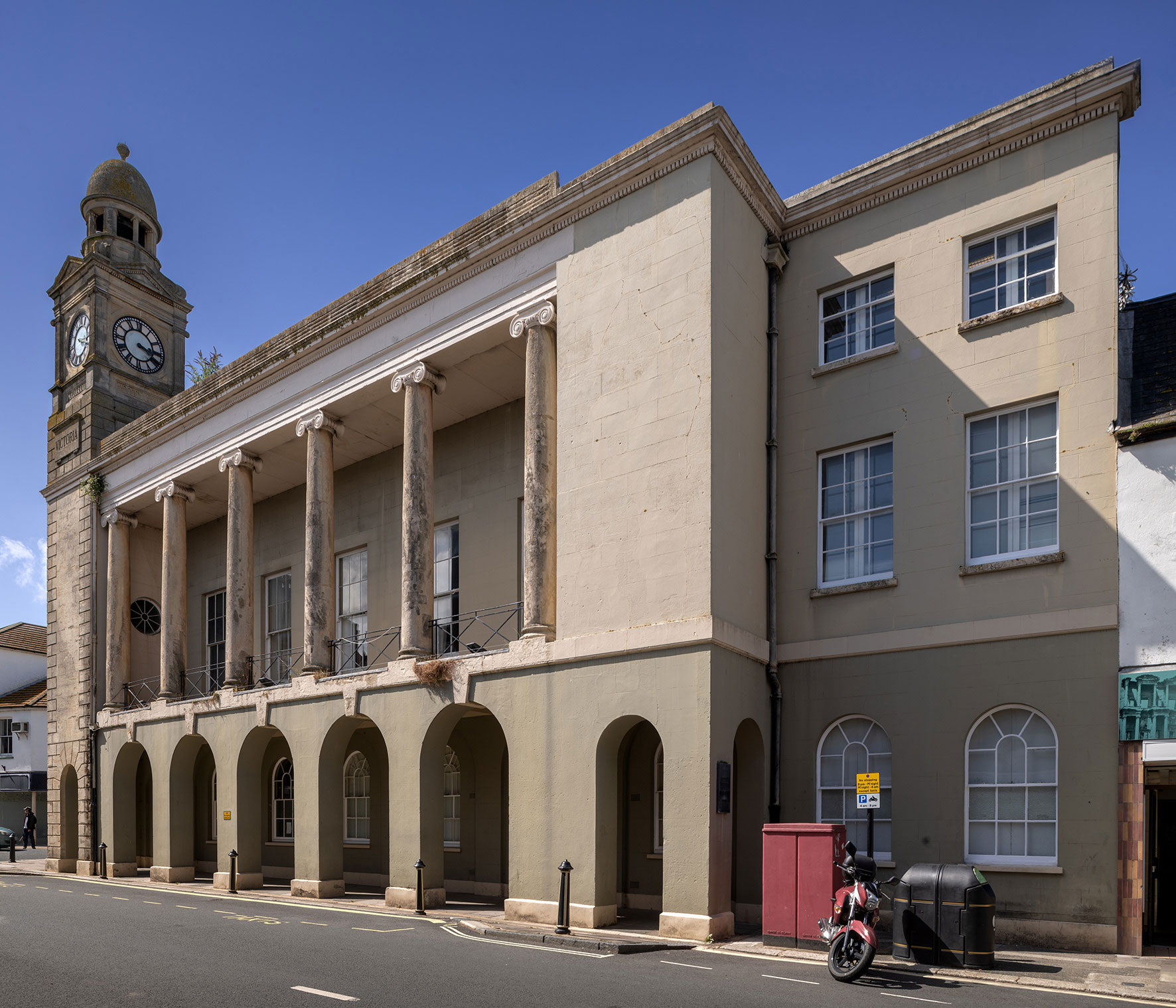 From the 1840s there were a number of alterations and two extensions. In 1843 a bracket clock was installed facing the High Street and probably at the same time a small cupola was added to the south-west corner. This provided a precedent for the addition of a grander clock tower on this corner in 1887-8. Designed by the local architect Robert Braxton Perres (1843-1915), it commemorated Queen Victoria’s Golden Jubilee. Partitions were gradually inserted in the market hall, which by the end of the century housed the town’s fire station, and its arcades were enclosed with windows and doors. In 1909, part of the ground floor towards the High Street was converted to public lavatories. By 1930, the ground floor also housed the town’s ambulance station.