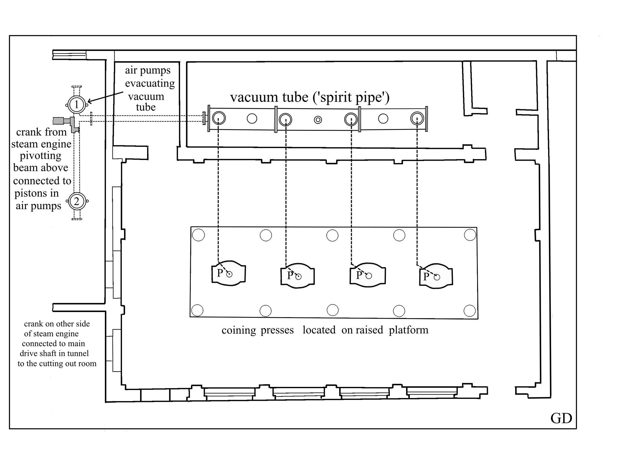 Boulton’s technological ambition was matched by his determination to obtain the contract to produce the national coinage, but he was initially disappointed on both counts. The presses in the first Soho mint were driven mechanically by the steam engine, but this motion proved to be too violent and an entirely new and radical method of applying power to the presses was developed. The steam engine was adapted to no longer rotate shafts, cog wheels and cams but instead to produce a vacuum in a tube, the ‘spirit pipe’, to which each press was connected in a complicated arrangement of levers and balancing beams to reduce the impact of the recoil.