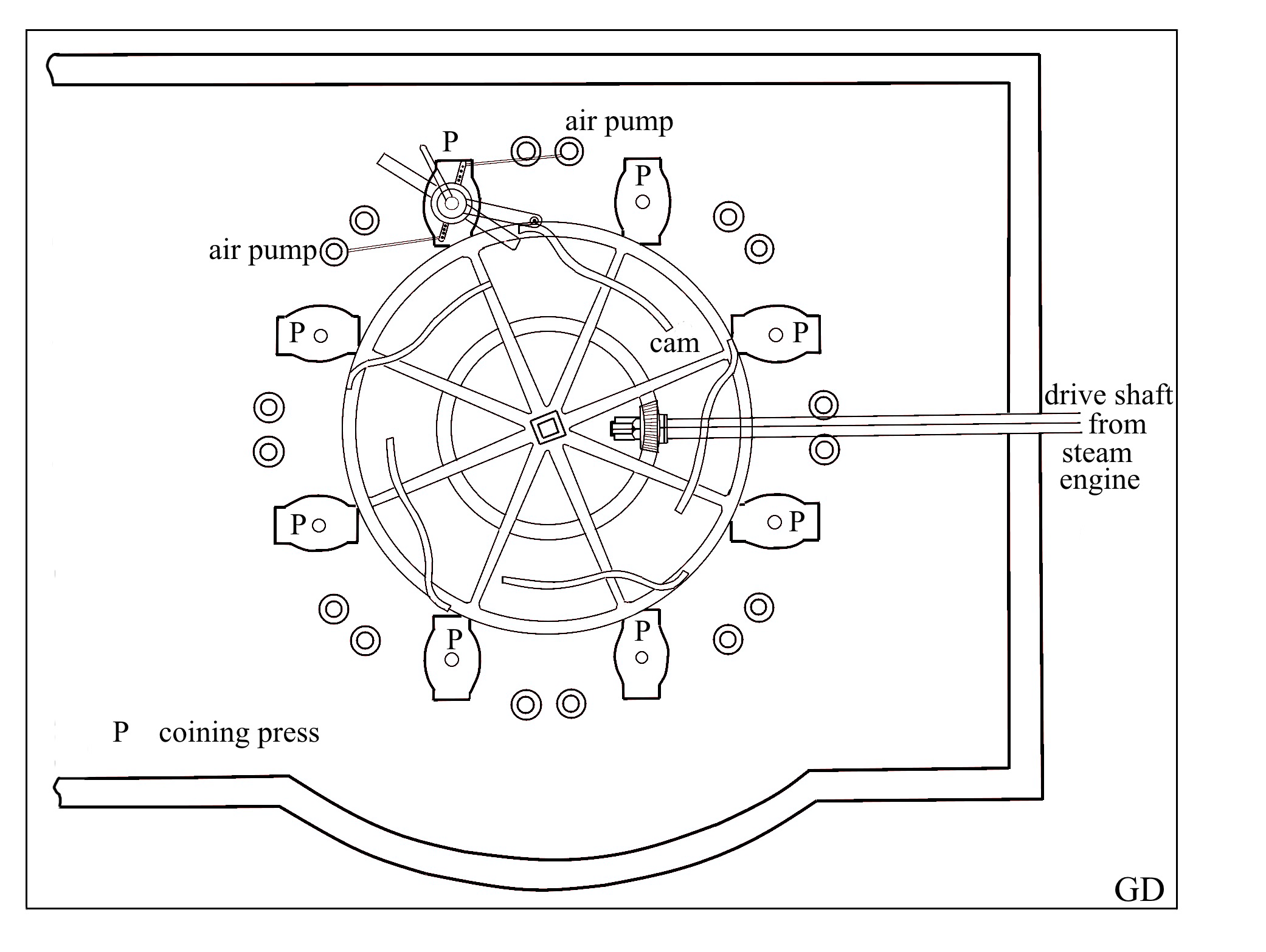 Boulton finally signed a contract to produce the national coinage in 1797 and the new vacuum-powered mint was ready by December 1798 to produce the famous but cumbersome and impractical ‘cartwheel’ pennies and twopences. The two distinctly different coining room layouts are illustrated below, showing the mechanical driven presses in a circle, and the vacuum-powered presses in a line. (Click on the images in turn to reveal the full size image).